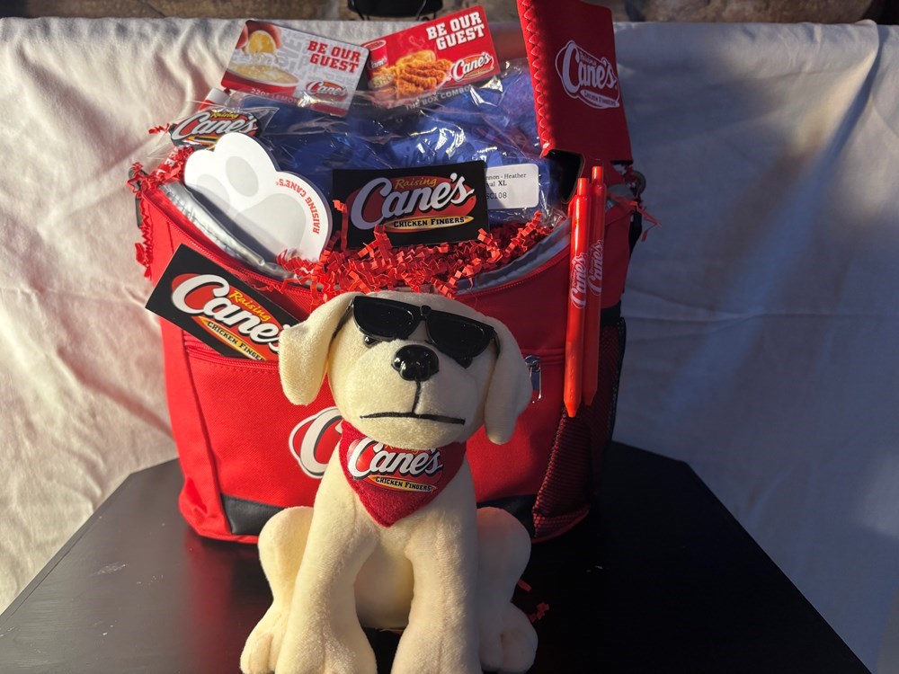 Loaded with signature goodies, this basket brings the flavor and fun of Raising Cane’s straight to your door. Perfect for fans of crispy tenders and good vibes! Don’t miss your chance to snag this finger-licking prize! 🐓🍟 Includes: Box combo & Lemonade gift cards Chapstick Dog Plushie T-shirt Cooler Pens Koozie Notepad Keychain 2 Magnets