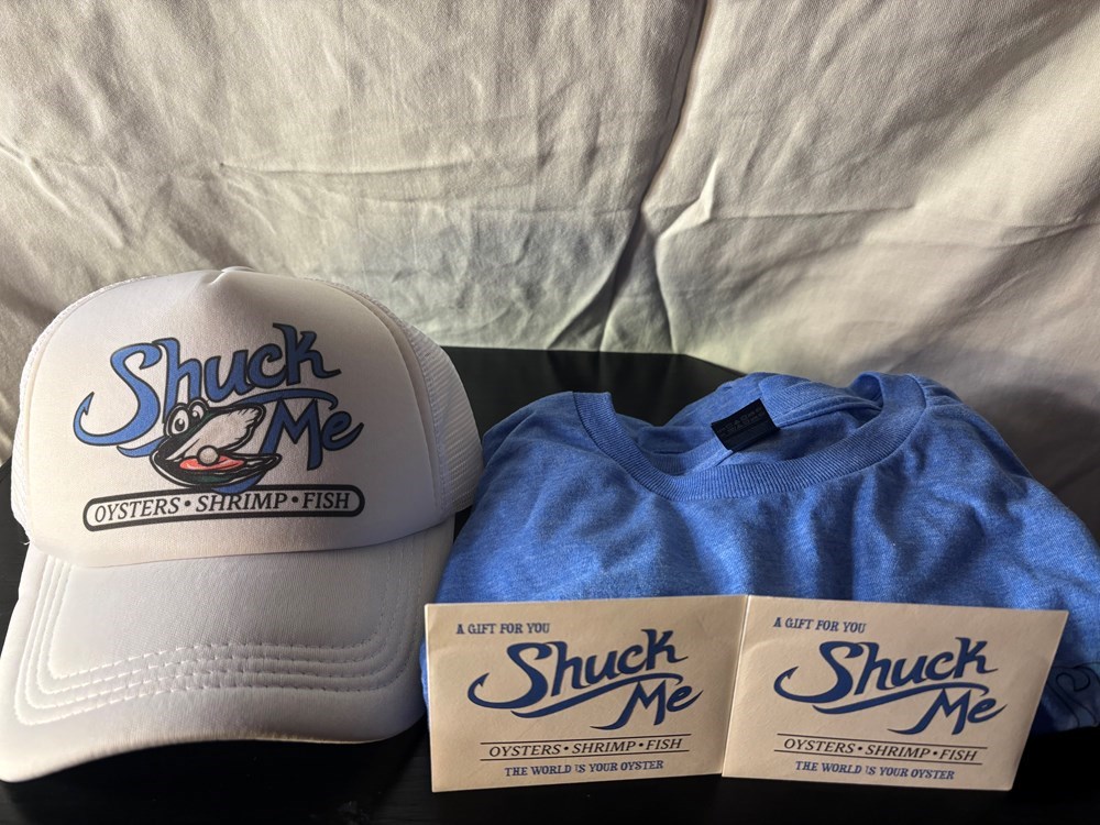 🎣 Reel in the Perfect Gift Basket! Dive into deliciousness with two $20 Shuck Me gift cards, your ticket to mouthwatering seafood. Plus, gear up in style with a Shuck Me hat and T-shirt—perfect for showing off your love of great food and good vibes. Don’t let this catch of the day slip away—bid now!