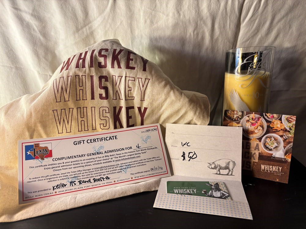 Savor the perfect blend of flavor and rhythm with "Sweet Whiskey & Southern Tunes." Indulge in the richness of whiskey-infused treats at Whisky Cake Kitchen and Bar before heading over to Billy Bob's Texas to soak up the lively energy of soulful southern music. It's an unforgettable pairing of sweet delights and foot-tapping melodies that captures the heart of southern charm. $50 Gift card to Whiskey Cake Eagle Rare Bourbon Candle Tote bag Free Appetizer 1 complimentary reserved admission for 4 at Billy Bob's Texas These certificates entitles you & your guests to an evening of fun at Billy Bob's Texas in the historic Fort Worth Stockyards. Enjoy reserved showroom seats to a concert of your choice at "The world's Largest Honky tonk". Choose from our upcoming shows, schedule available at www.bollybobstexas.com To redeem, email the ticket office. Advance reservations with the Ticket Office are required. Once arrangements are made, you will pick up the tickets from Will Call and will collect the physical certificate at that time. "Concert selection I subject to availability. Not valid for entertainers that prohibit usage due to contract restrictions. *non-transferrable and BBT age restrictions apply. Expires 5/1/26
