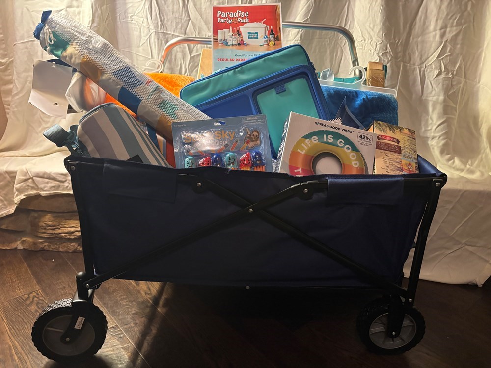 Embrace the sunshine with the Fun in the Sun Set! Packed with outdoor essentials like comfy beach towels, a wireless speaker for playing your favorite tunes, and a wagon for carting all the playful accessories, this set is perfect for beach days, picnics, or poolside lounging. It's your ultimate companion for soaking up the sun and making summer memories. Paradise Party Pack from Bahama Buck's Academy Sports Wagon Travel Cooler 2 Beach Towels Inflatable Pool Ring Margaritaville Lantern/Wireless Speaker Beach Umbrella 2 Beach Lounge Chairs Pool Toys Beach Blanket Waterproof Ground Cover