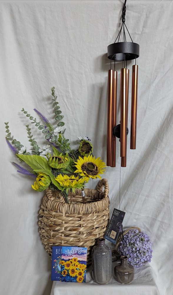 Turn your home into a haven with this enchanting garden decor basket, packed with soothing and stylish treasures! Feel the calming energy of healing stone wind chimes as they dance in the breeze, add timeless charm with handcrafted stoneware pottery, and invite nature’s beauty with vibrant pollinator and sunflower flower seeds. With additional delightful accents including silk flowers, a snowball flower orb, and the chunky woven basket itself, this is the perfect blend of tranquility and elegance🌸🌿
