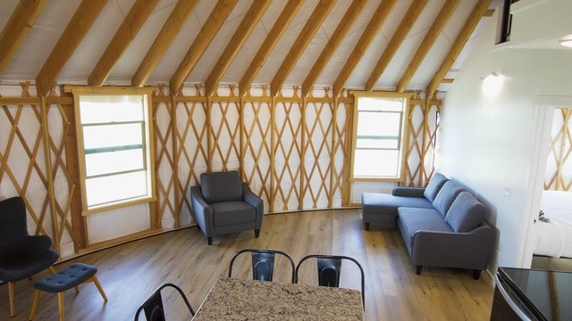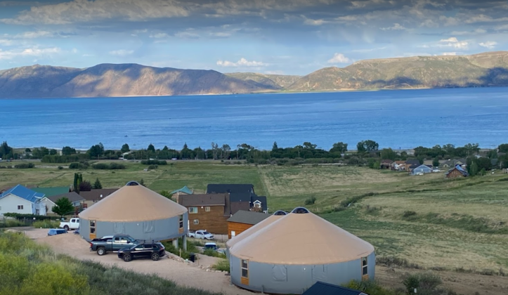 LOCATION Garden City, UT ABOUT THE RESORT You have never experienced camping like this! Try the largest yurt built in North America at 40 feet in diameter totaling 1556 square feet of luxury living space. These Bear Lake rentals contains 2 large bedrooms and a children’s play loft/ overflow sleeping area, a full kitchen, and large oversized bathroom with two private toilets, large walk in shower, two sinks, washer and dryer. TV to stream movies and fireplace to warm your feet! The kitchen comes stocked with everything you will need to prepare meals, including: pots and pans, bakeware, dishes for 12 including mugs, plates, bowls, and glasses, also children’s plates, bowls, and cups, silverware, spoons, spatulas, measuring cups, grater, knives, etc. Kitchen has a stove, oven, microwave, dishwasher, refrigerator, toaster, kettle, coffee pot with filters. A small supply of paper towels, trash bags, dishwasher detergent, and dish soap will be available. Each yurt is individually decorated representing the significance of the Bear Lake area. This may be the most unique rental experience available in the West! The beautiful wood beams that support the yurt are mesmerizing and give a feeling of peace and symmetry not found in your ordinary nightly Bear Lake rental cabin. ACTIVITIES NEARBY Oso Blu’s location makes every aspect of boating available including paddle boarding, kayaking, jet skiing, and sailing, if it is done on the water it’s available and convenient to you and your family while staying at Oso Blu. Do you fish? Bear Lake has some of the largest lake trout in the state of Utah and a fish pond for the kids a short walk from your front door located at Garden City’s Heritage Park. If you prefer river fishing, you are just minutes away from Logan River where the fish are abundant, the crowds are minimal, and the mountain serenity is unmatched. Do you need a UTV or ATV motorized adventure? If so, head out on your adventure from our property with hundreds of miles of motorized access in the surrounding mountains. Time to hit the mountain or road bike, buckle your helmet for rides you will never forget. Bear Lake has become a hot bed for road racing around the lake and was recently a part of the Tour of Utah professional race broadcast worldwide. And for families with children Oso Blu connects directly with the Garden City Bike Path for some great adventures!