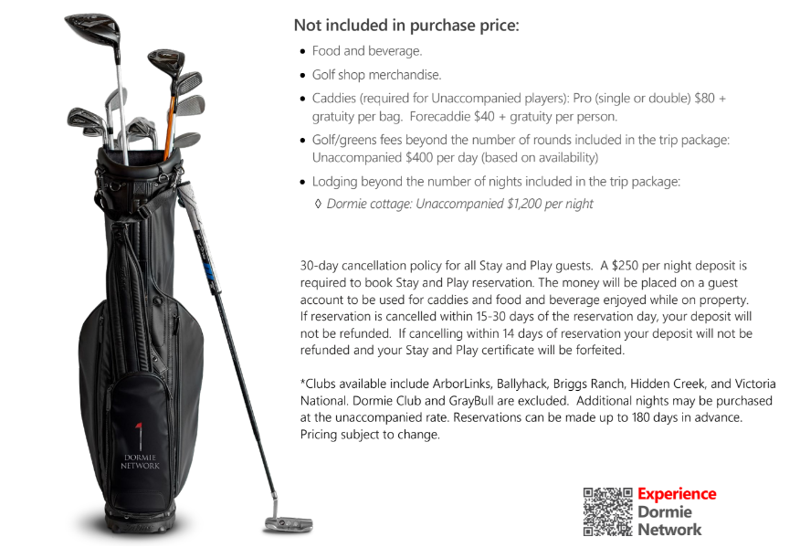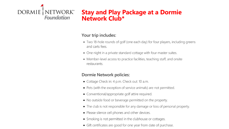 Dormie Network Stay & Play Golf Getaway Value: $5,400 Escape to one of Dormie Network’s premier private golf clubs for the ultimate luxury golf experience! Your package includes: Two days of unforgettable golf for four players, with two 18-hole rounds (one per day) including greens and cart fees One-night stay in a private Dormie Cottage with four master suites Member-level access to practice facilities, teaching staff, and on-site dining Choose from five elite Dormie Network clubs: ArborLinks, Ballyhack, Briggs Ranch, Hidden Creek, or Victoria National (Dormie Club and GrayBull excluded). You’ll have 12 months from the event date to use your certificate and can book your stay up to 180 days in advance. Please note: Food, beverages, and golf shop merchandise are not included Caddie fees apply (required for unaccompanied guests) A $250/night deposit is required and applied to your guest account for use during your stay Additional nights and rounds can be added at unaccompanied rates 30-day cancellation policy applies Dress code, mobile phone etiquette, and Dormie Network policies must be followed. No pets or outside food/beverage permitted. This is more than a golf trip—it's a chance to live like a member at some of the country’s most exclusive clubs. Perfect for a buddy trip, celebration, or once-in-a-lifetime experience. More information: https://www.dormienetwork.com/experience-at-a-glance