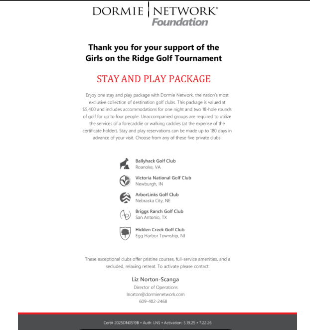 Welcome to the Girls on the Ridge Golf Classic Silent Auction! Every bid you place helps empower young women in sports by funding equipment, transportation, team development, leadership opportunities, and more.