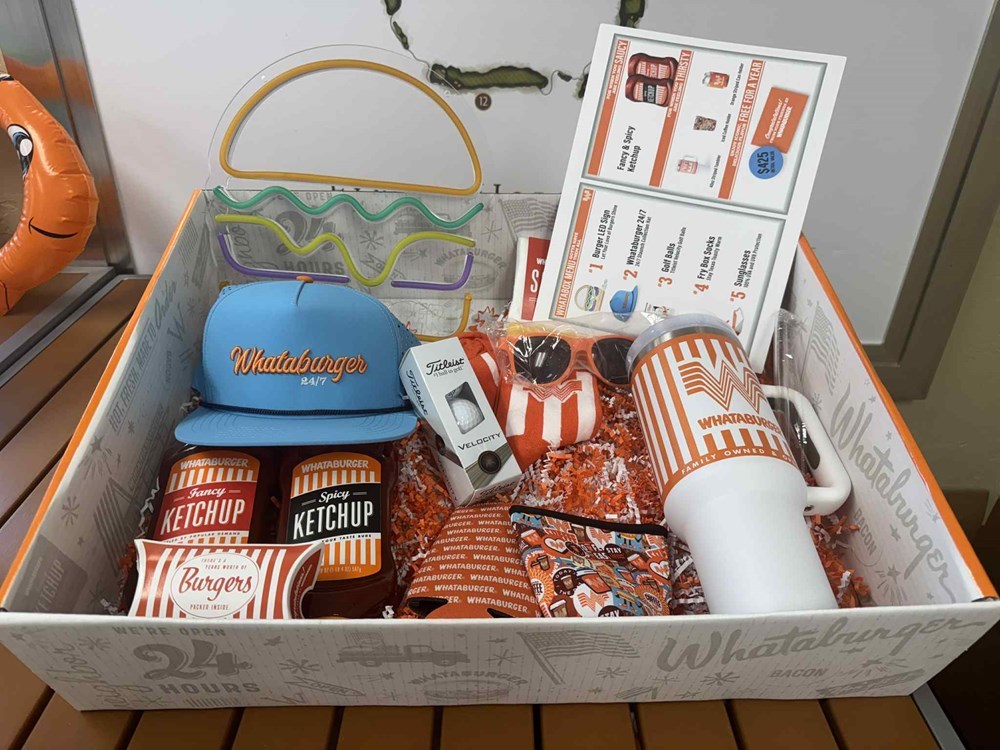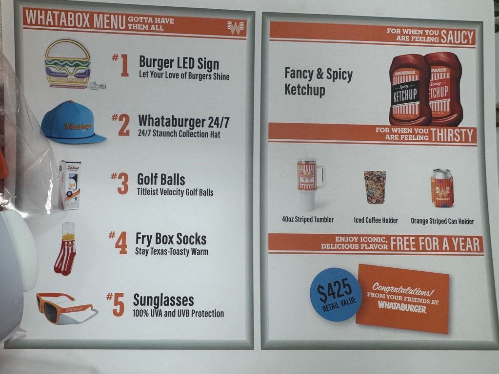 Craving that perfect combo of style, spice, and straight-up Texas pride? This Whataburger Mega Bundle is here to serve up bold flavor and even bolder flair—from headwear to ketchup, golf balls to fry socks. Whether you're repping the brand on the course or just looking extra saucy at your next tailgate, this box has everything but the fries. Includes: 🍔 LED Burger Sign – Let your love of burgers literally shine 🧢 Whataburger 24/7 Hat – Staunch style, all day every day 🏌️♂️ Titleist Velocity Golf Balls – With a side of Whataburger swagger 🧦 Fry Box Socks – Because your feet deserve to feel “toasty warm & well-seasoned” 🕶 Sunglasses – 100% UVA/UVB protection with 110% Texas cool 🧃 40oz Striped Tumbler – Hydrate like a hero ☕ Iced Coffee Holder – For your early-morning burger runs 🍺 Orange Striped Can Holder – Keep that drink cool and classy 🌶 Fancy & Spicy Ketchup Combo – For when you’re feeling saucy AND sophisticated 🍔 Whataburger for a Year – Yes, you read that right. ICONIC flavor, free for a year Value: $425 Slogan Option: “Bring home the heat, the drip, and the fries—minus the drive-thru line.” Alternate: “The only combo meal that comes with golf balls and bragging rights.”
